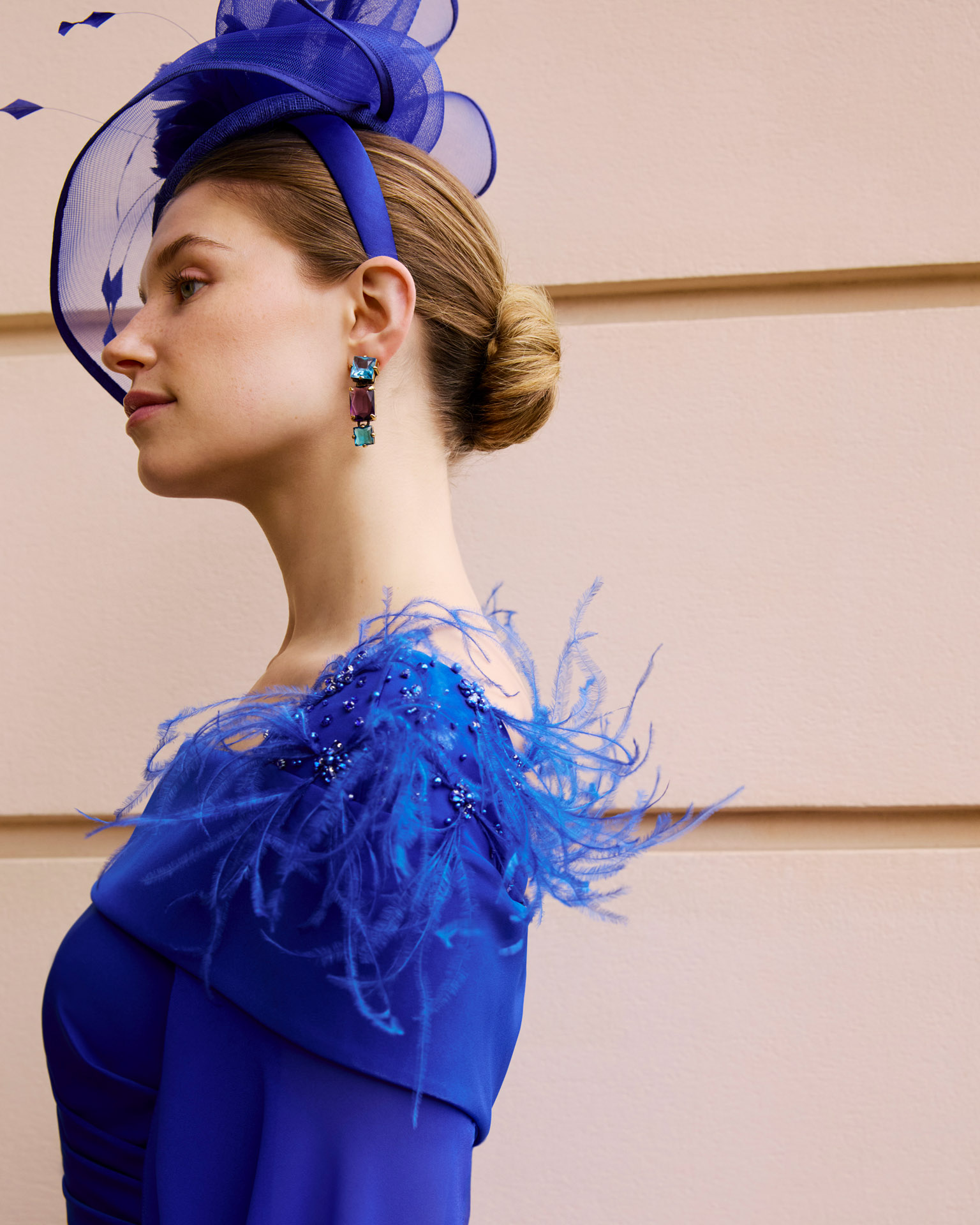 Cobalt crepe dress with boat neckline,feather detail on shoulder, cape effect open sleeve