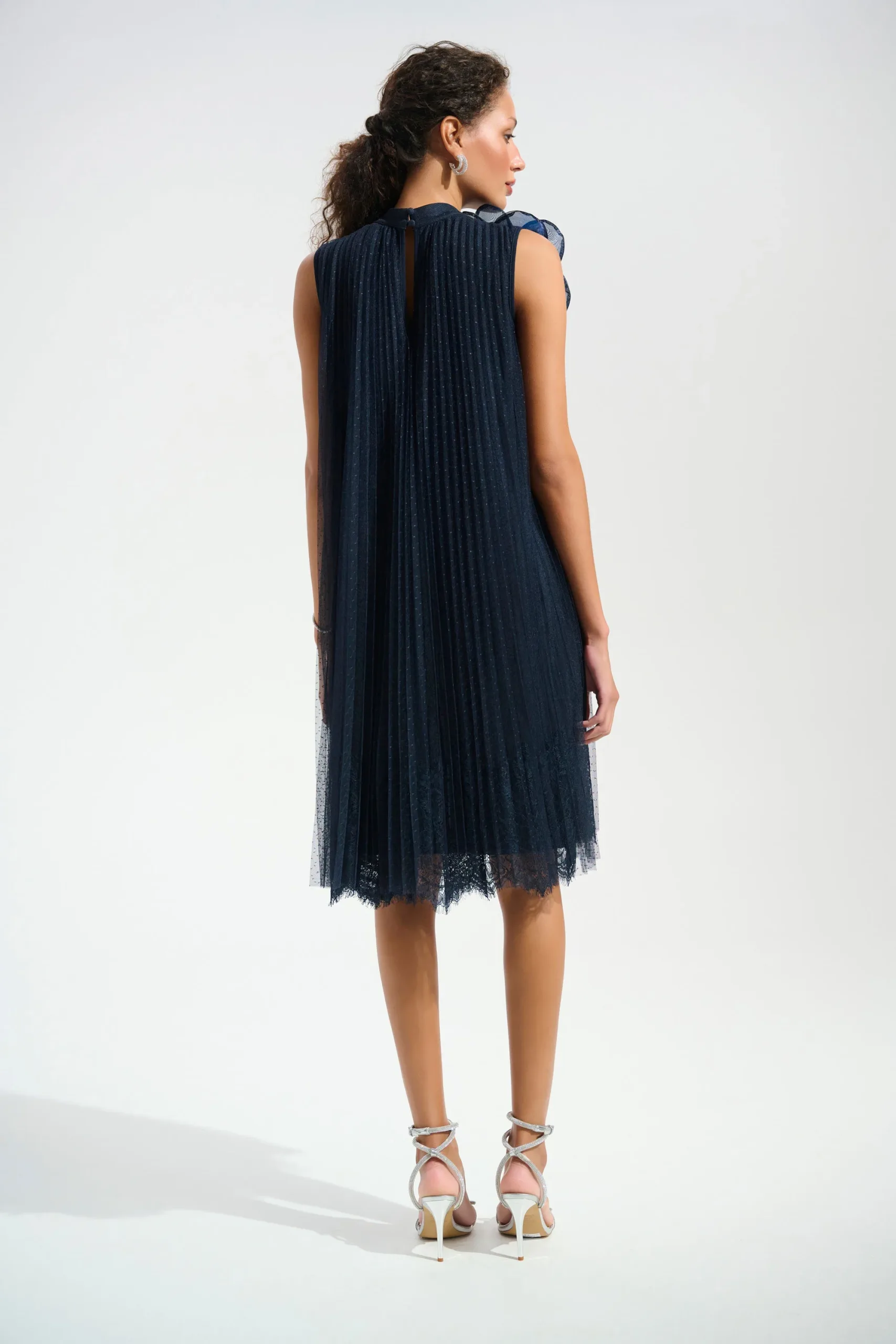Joseph Ribkoff mesh A line dress with organza floral detail, pleated in midnight