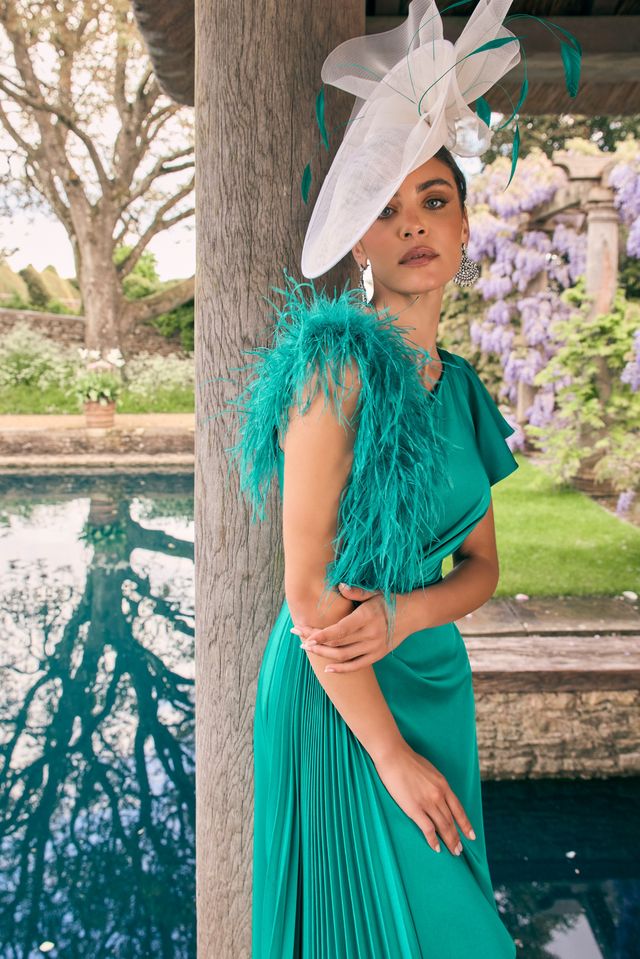 Cap sleeves and delicate feather strap detailing add a touch of drama and sophistication